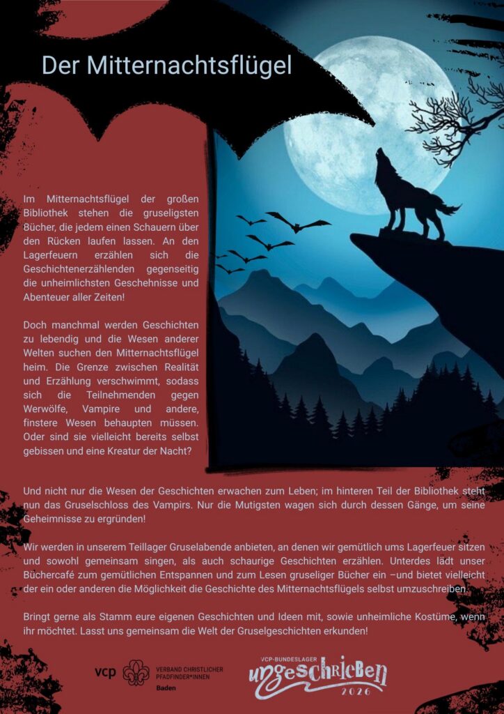 Im Mitternachtsflügel der großen Bibliothek warten schaurige Bücher auf euch, am Lagerfeuer werden unheimliche Geschichten lebendig, und ins Gruselschloss des Vampirs trauen sich nur die Mutigsten.